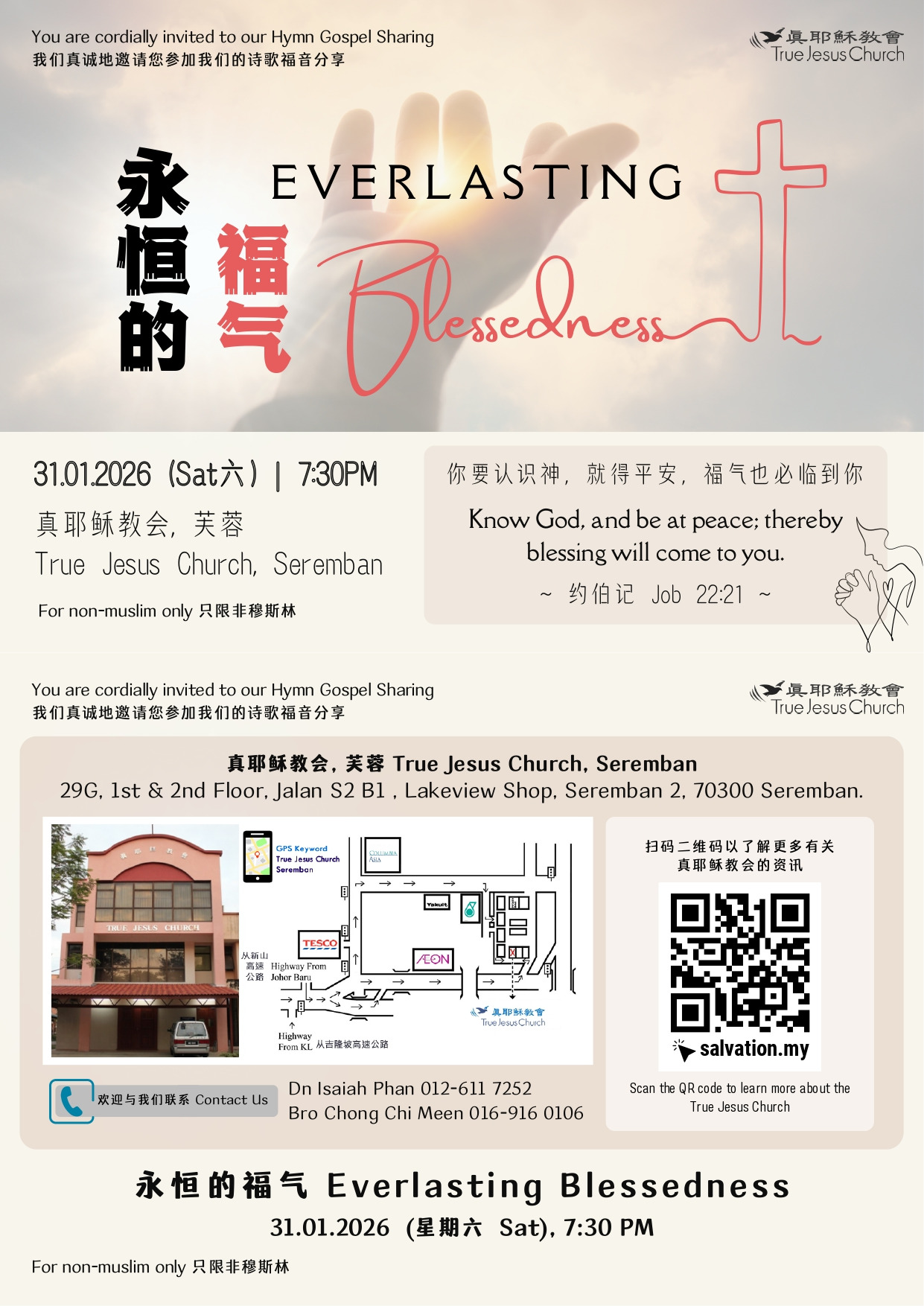 • 地点: True Jesus Church Seremban, 29G, 1st & 2nd Floor, Jalan S2 B1 , Lakeview Shop, Seremban 2, 70300 Seremban.